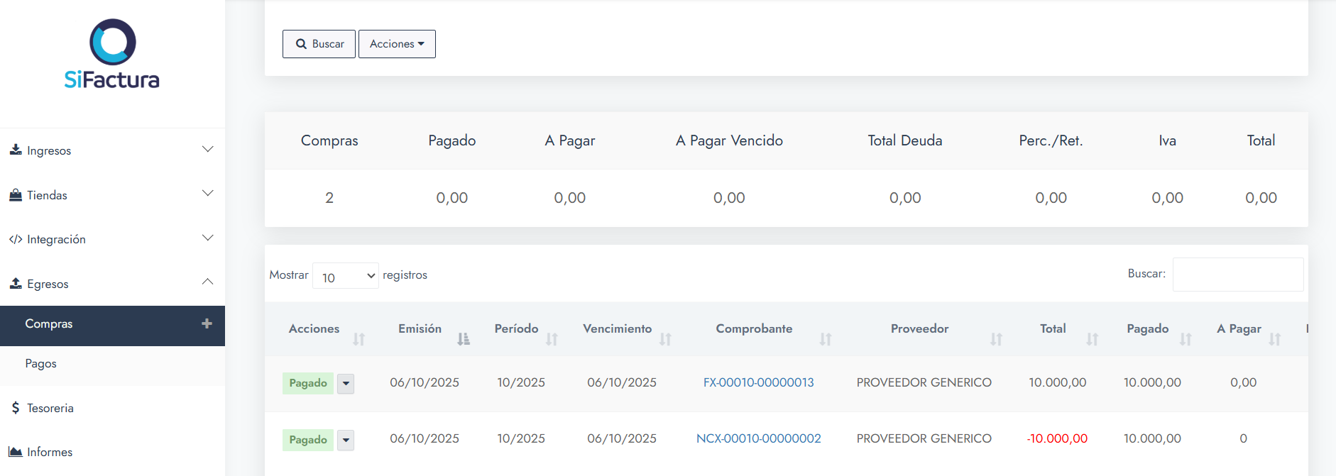 - Desde Egresos > Compras, tanto la factura como la nota de crédito figurarán con estado Pagado.