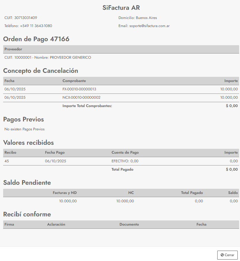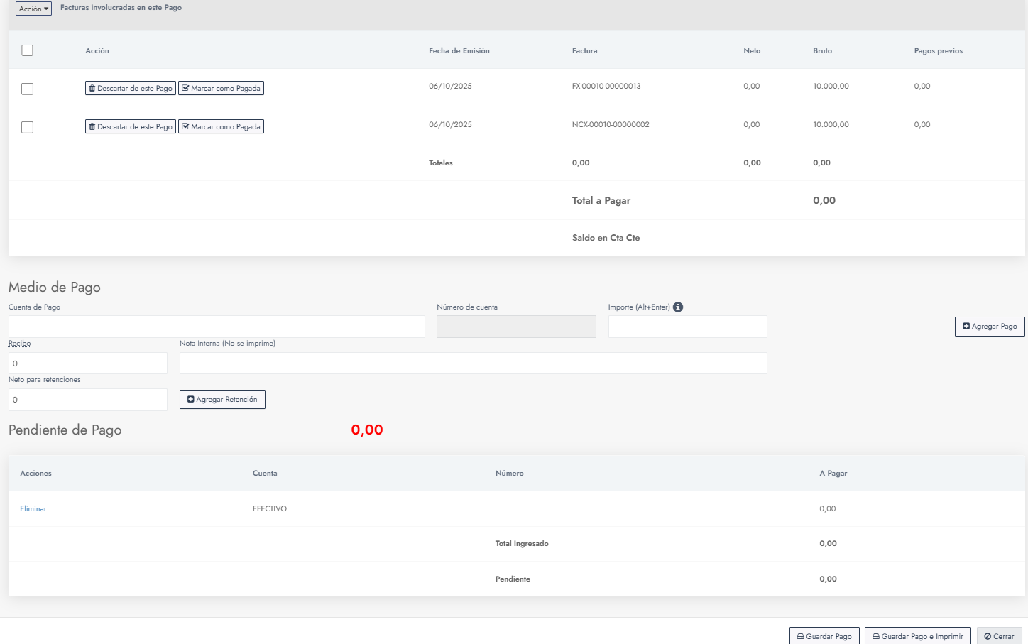 - El sistema generará una Orden de Pago por $0, dejando registrada la imputación de la Nota de Crédito a la Factura.