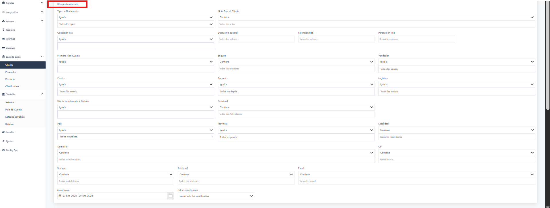 La búsqueda avanzada amplía las opciones de filtrado del listado de clientes, permitiendo combinar múltiples filtros en una misma búsqueda.