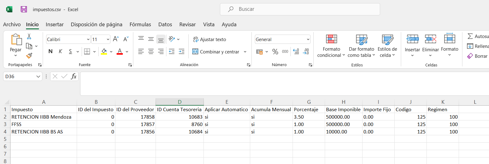Cada fila del archivo representa un impuesto aplicado a un proveedor.