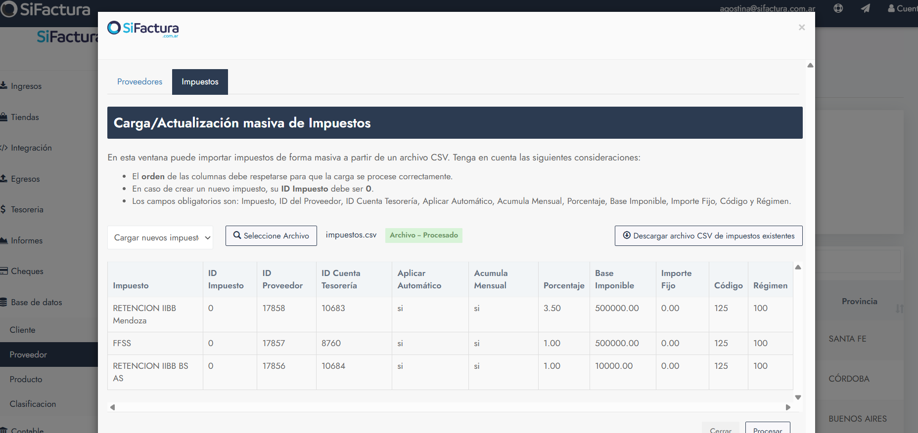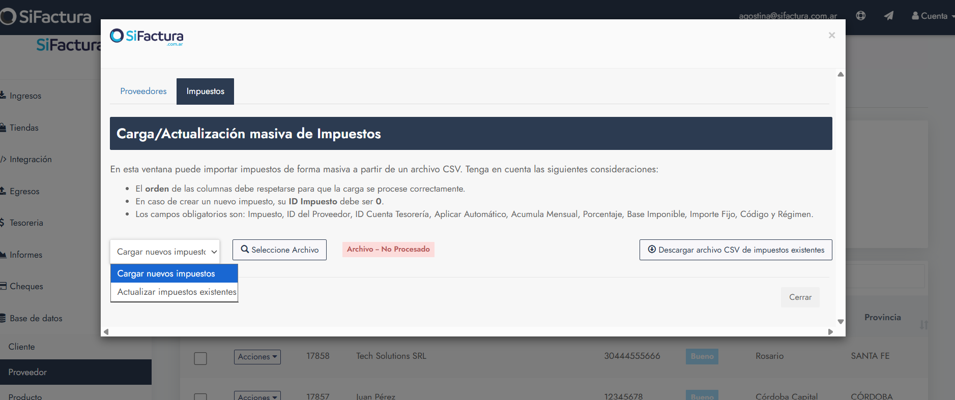 Este artículo explica cómo cargar, actualizar o replicar impuestos a los proveedores de forma masiva en SiFactura, utilizando un archivo CSV descargado desde la sección Proveedores y trabajado directamente en Excel.