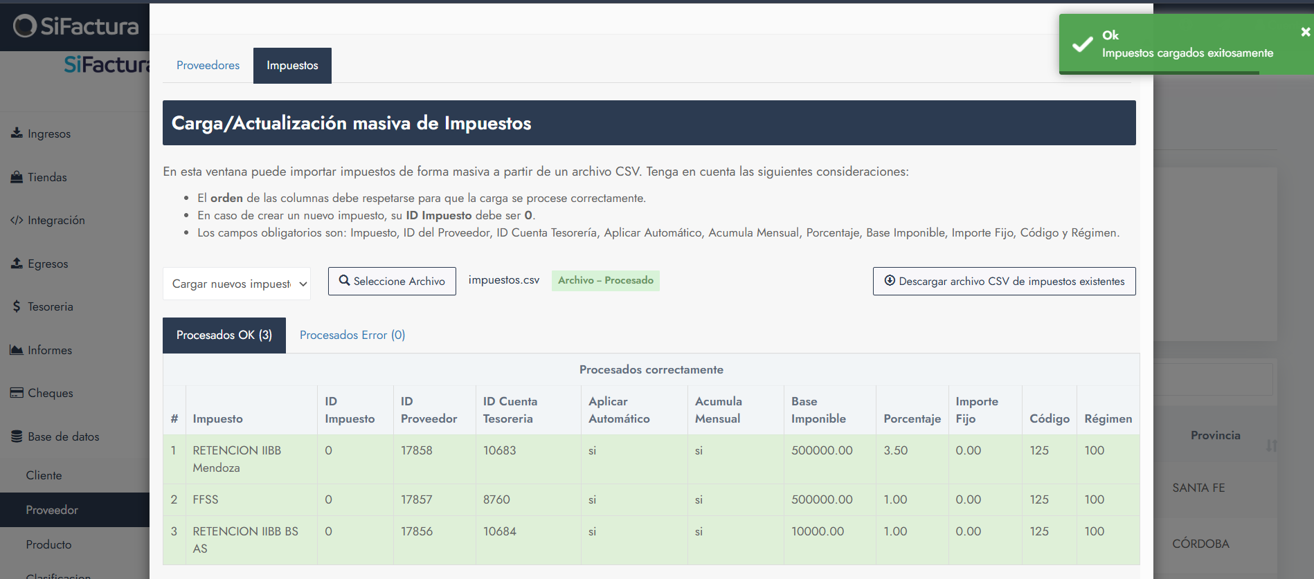 Recién en este paso los impuestos quedan creados o actualizados en SiFactura.