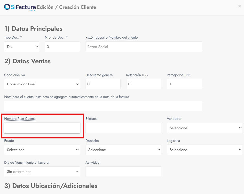 - En el campo Nombre Plan Cuenta, al comenzar a tipear el nombre o el ID de la cuenta contable, el sistema mostrará una lista autocompletada con las cuentas disponibles del plan contable.