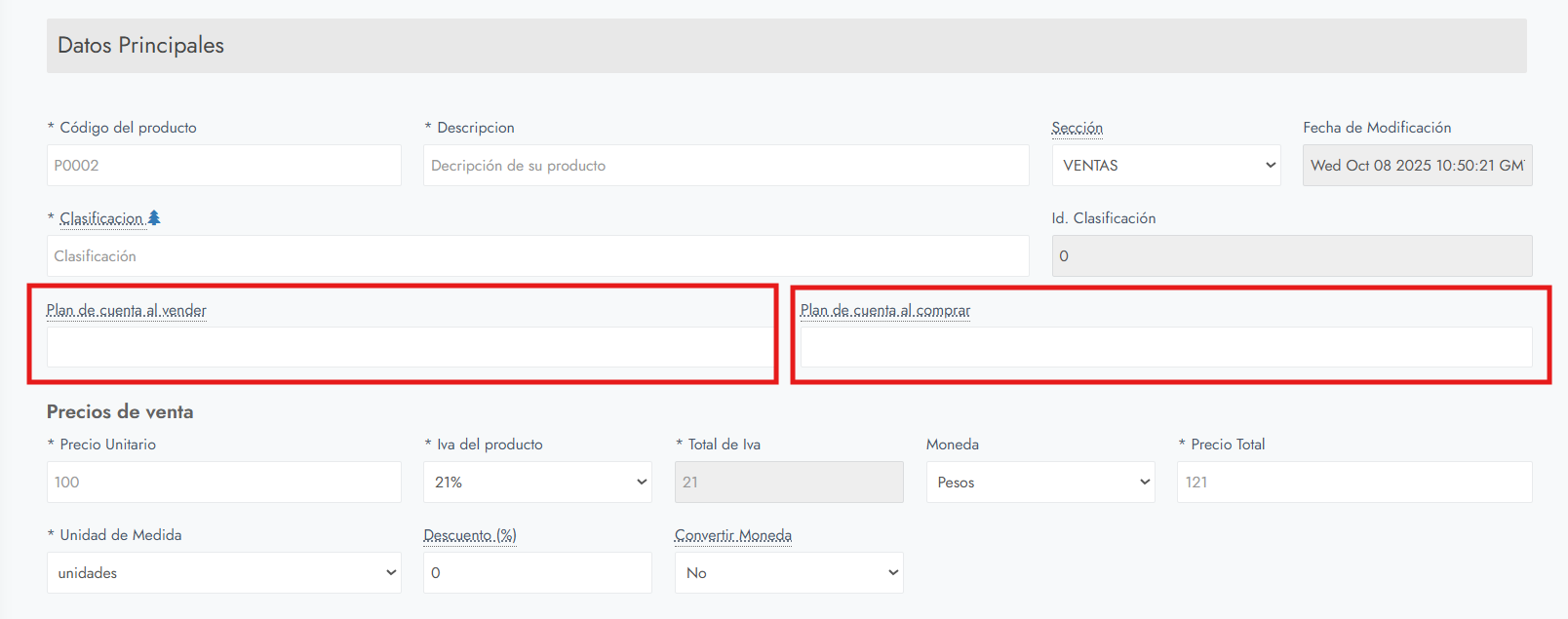 Cada producto puede tener asociadas dos cuentas contables: