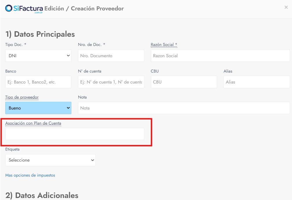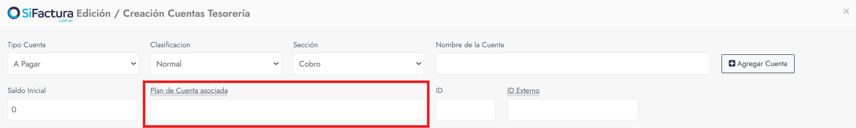 - En el campo Asociación con Plan de Cuenta, al comenzar a tipear el nombre o el ID de la cuenta contable, el sistema mostrará una lista autocompletada con las cuentas disponibles del plan contable.