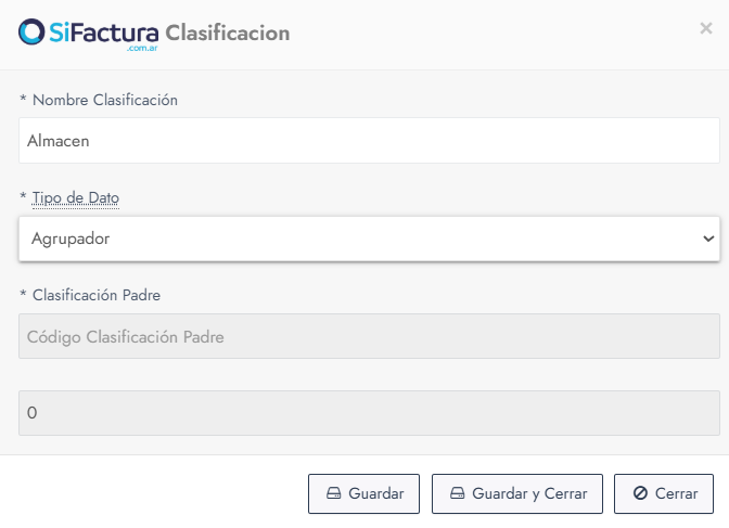 Nombre Clasificación | Tipo de Dato | Clasificación Padre |