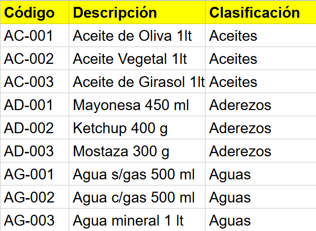 Por ejemplo, si tu empresa maneja artículos de distintos tipos, puedes estructurarlos así: