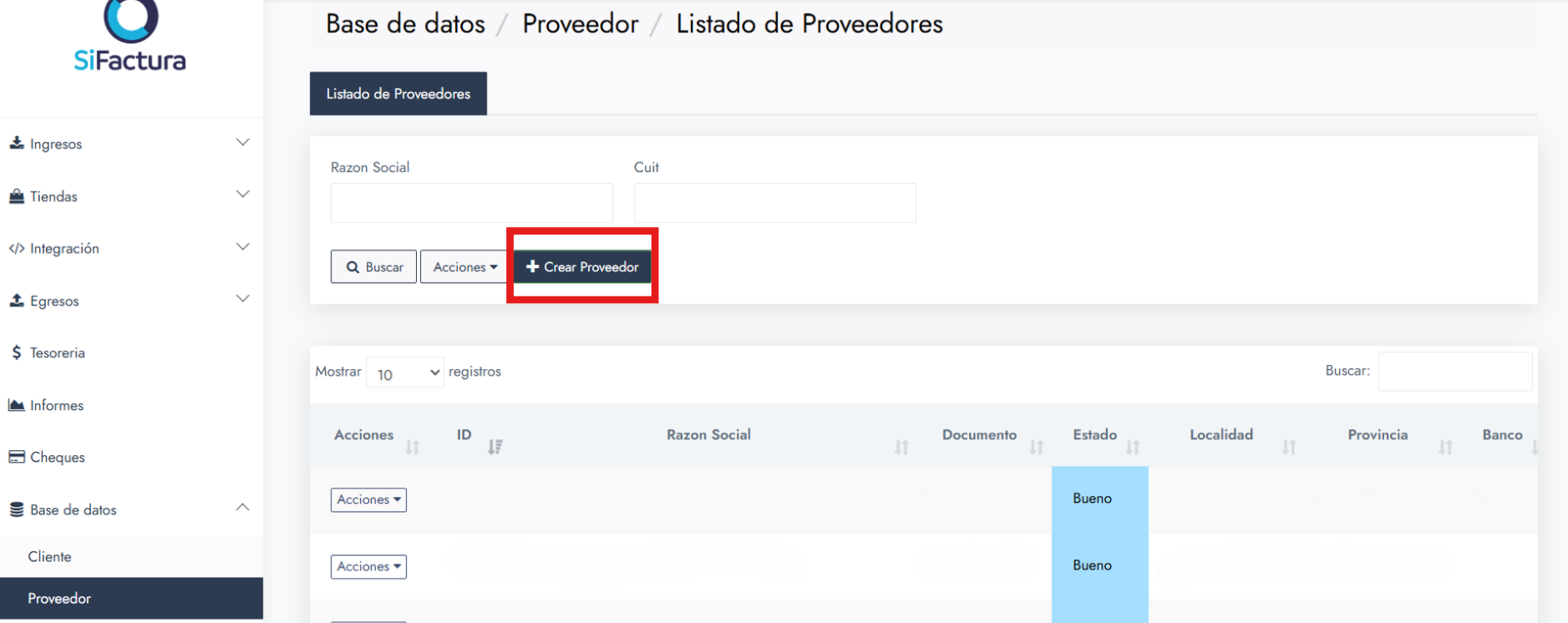 - En el menú lateral, dirígete a la sección Base de datos > Proveedor.