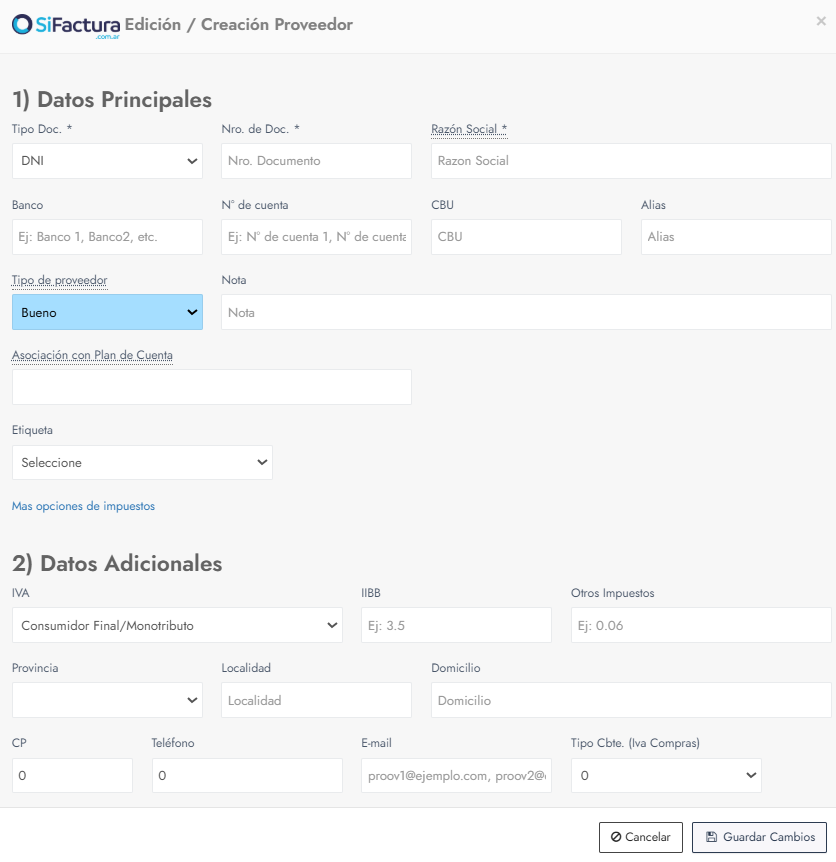 Ventana emergente con campos para crear un proveedor1. Datos principales