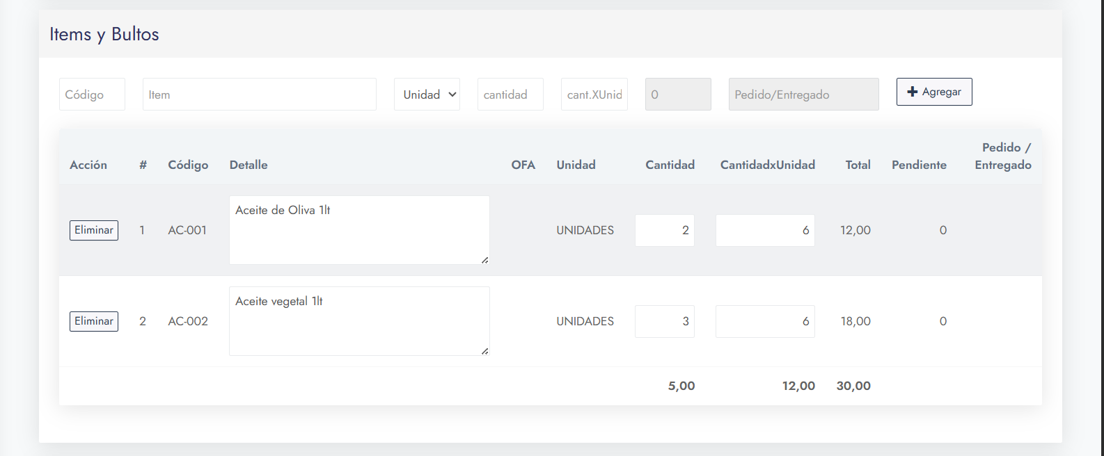 - Cantidad x unidad: cantidad de unidades por cada bulto.