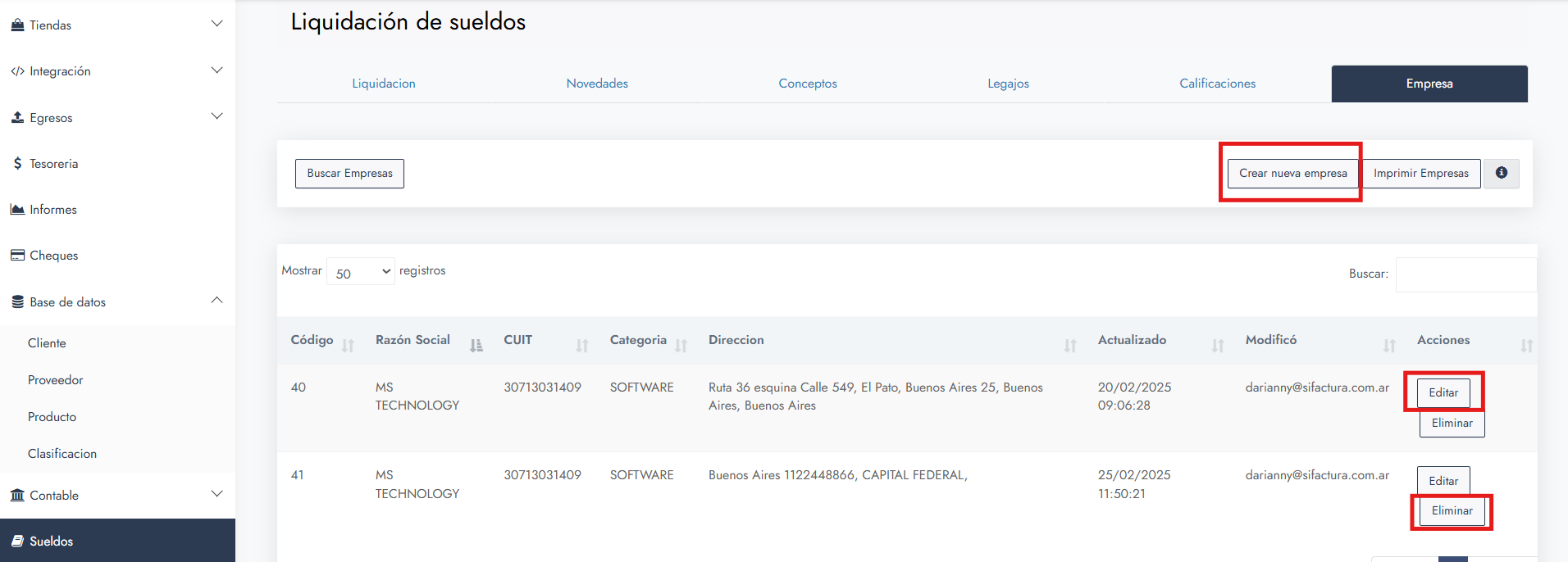 - Desde la misma tabla en Sueldos y haz clic en Empresa, ubica la empresa que deseas eliminar.