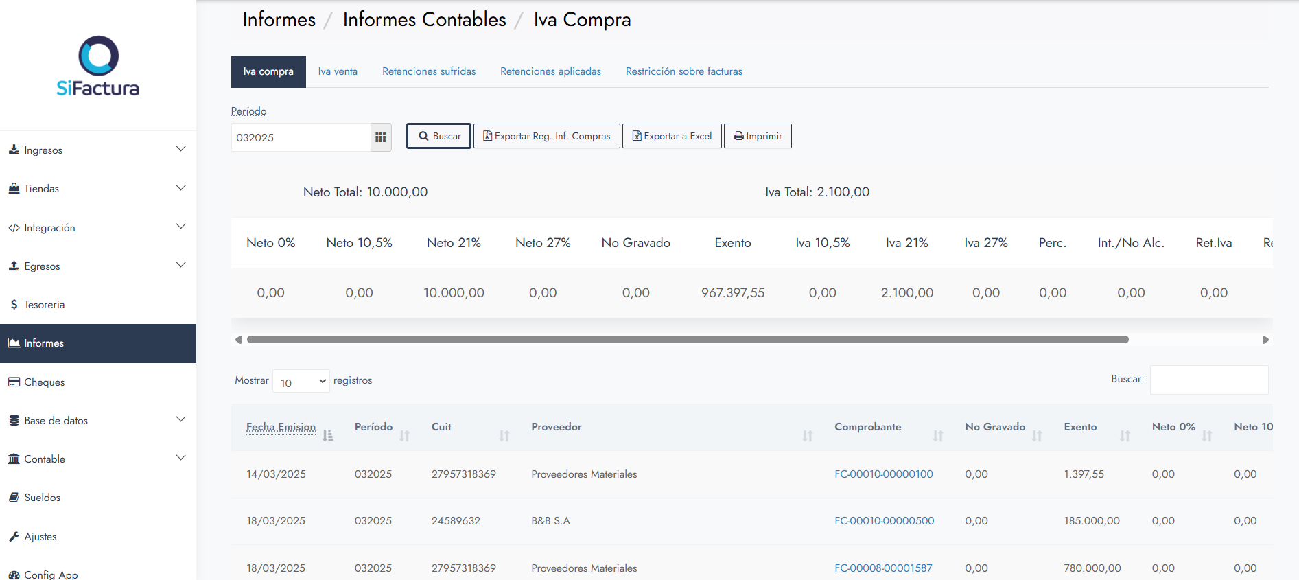 En la parte superior del informe se visualizan los totales generales, incluyendo montos de IVA por alícuota y valores exentos o no gravados, lo que facilita la conciliación con las declaraciones fiscales.