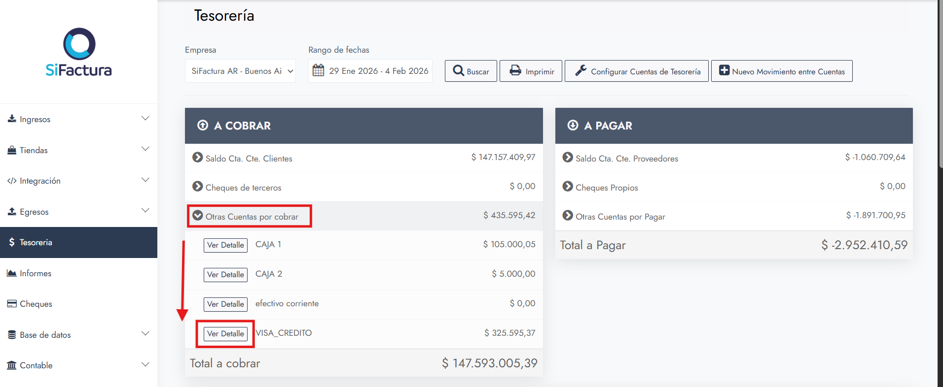 Una vez aplicado el rango de fechas en Tesorería, las cuentas de tarjeta no se muestran de forma directa.