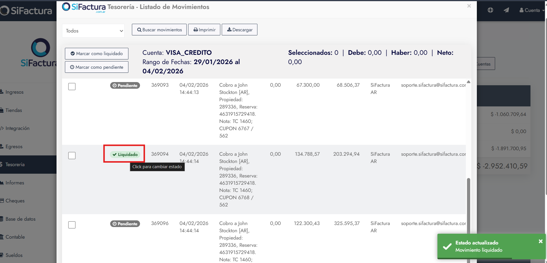El sistema actualizará automáticamente el estado del movimiento o movimientos modificados.