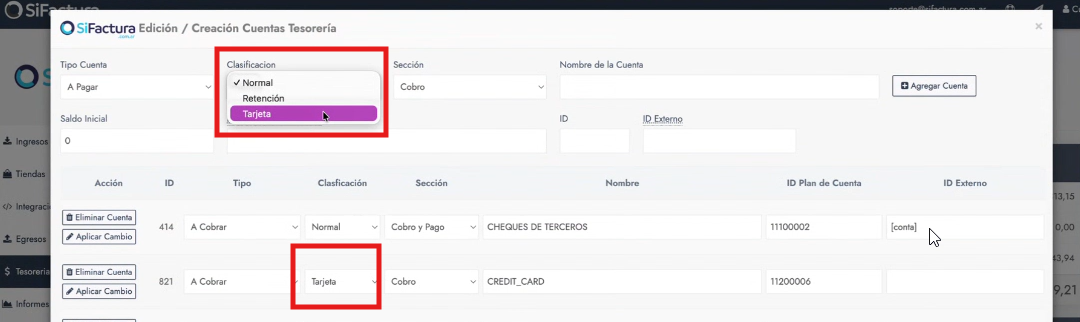 Si la cuenta ya existe, editarla y cambiar su clasificación a Tarjeta.