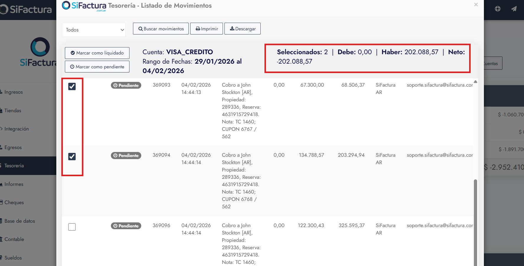 A medida que se seleccionan movimientos, el sistema recalcula automáticamente los importes mostrados en el resumen superior (Debe, Haber y Neto), reflejando exactamente qué operaciones están siendo consideradas.