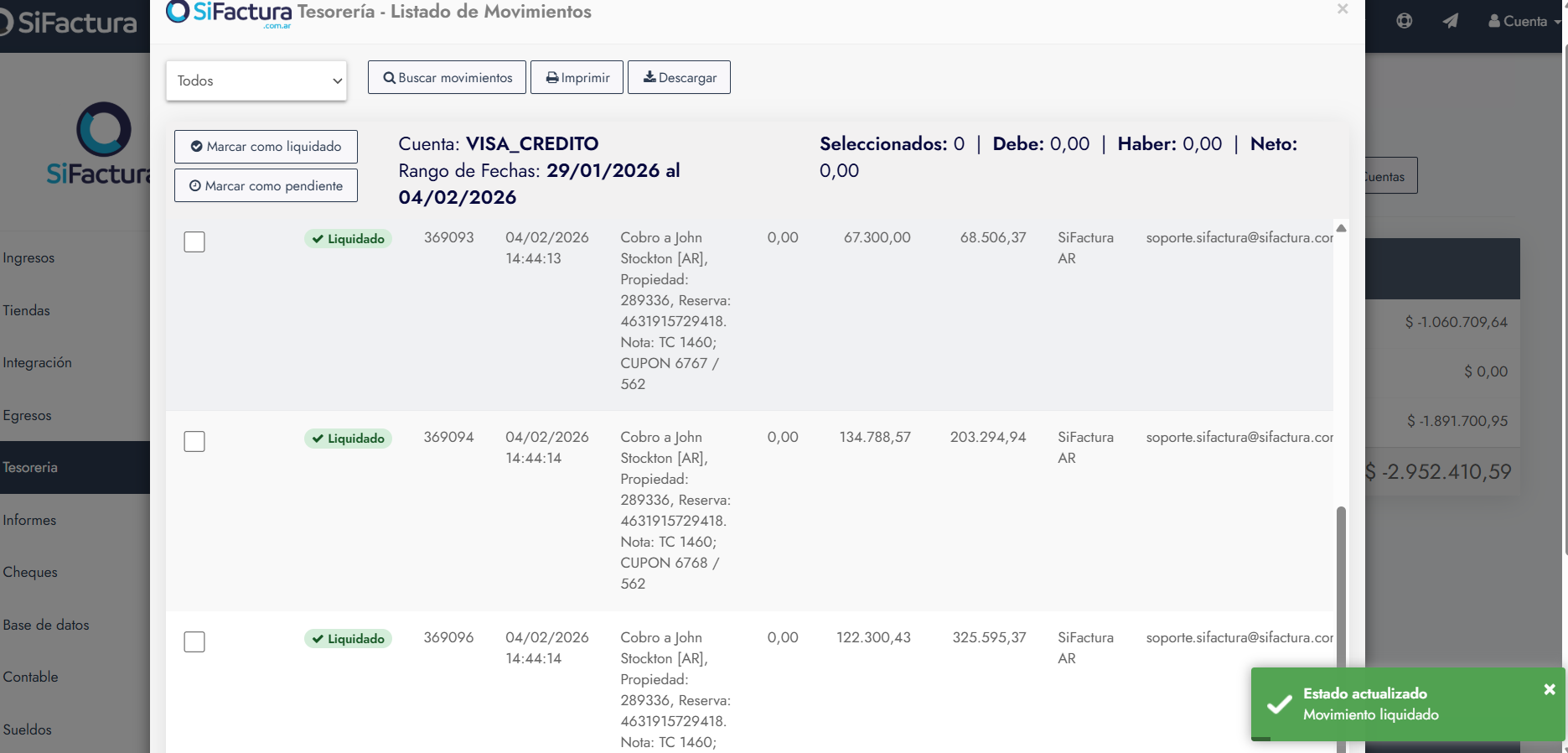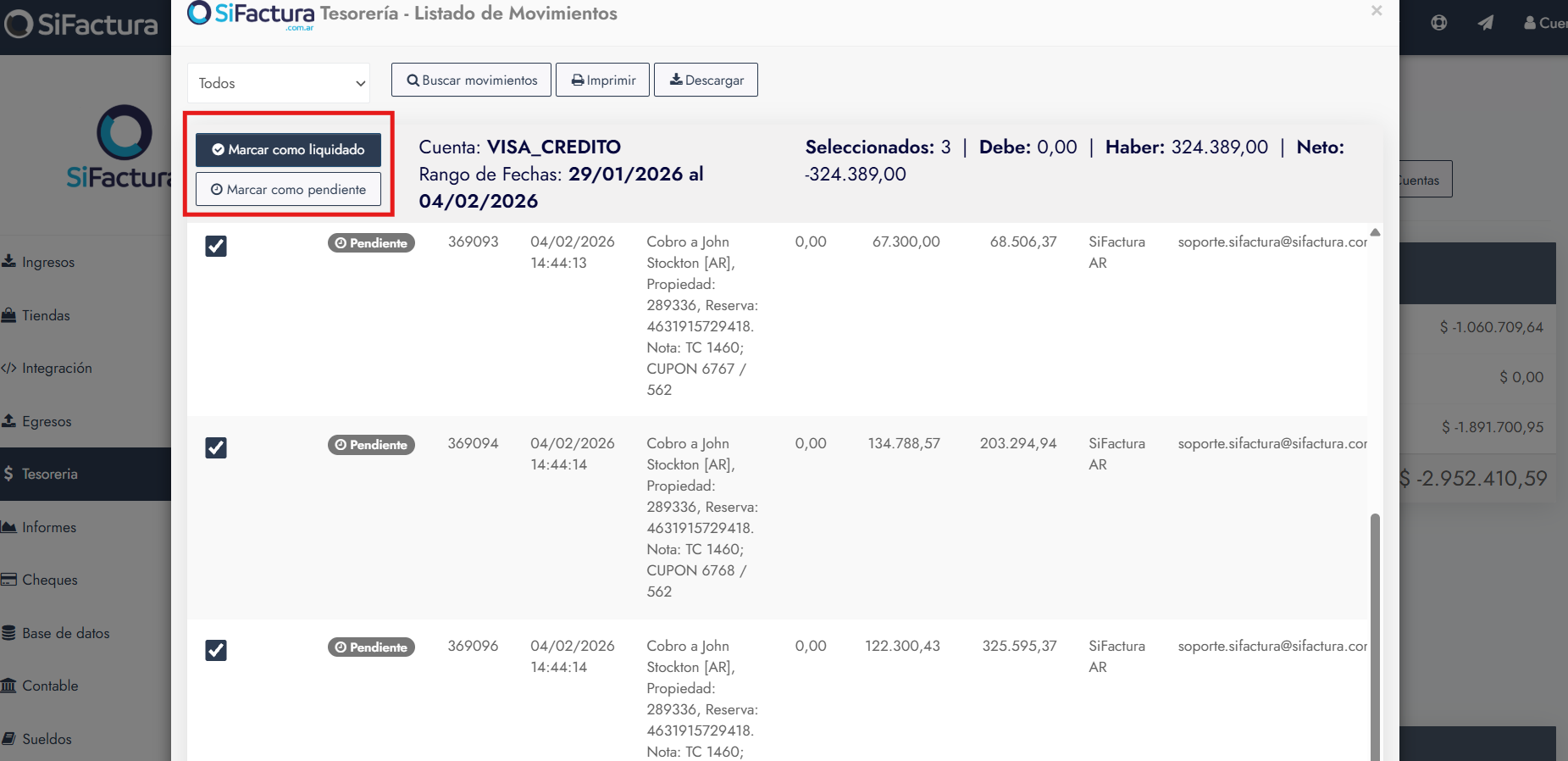 El sistema siempre suma y muestra los totales según los movimientos seleccionados, permitiendo entender claramente qué se está liquidando.