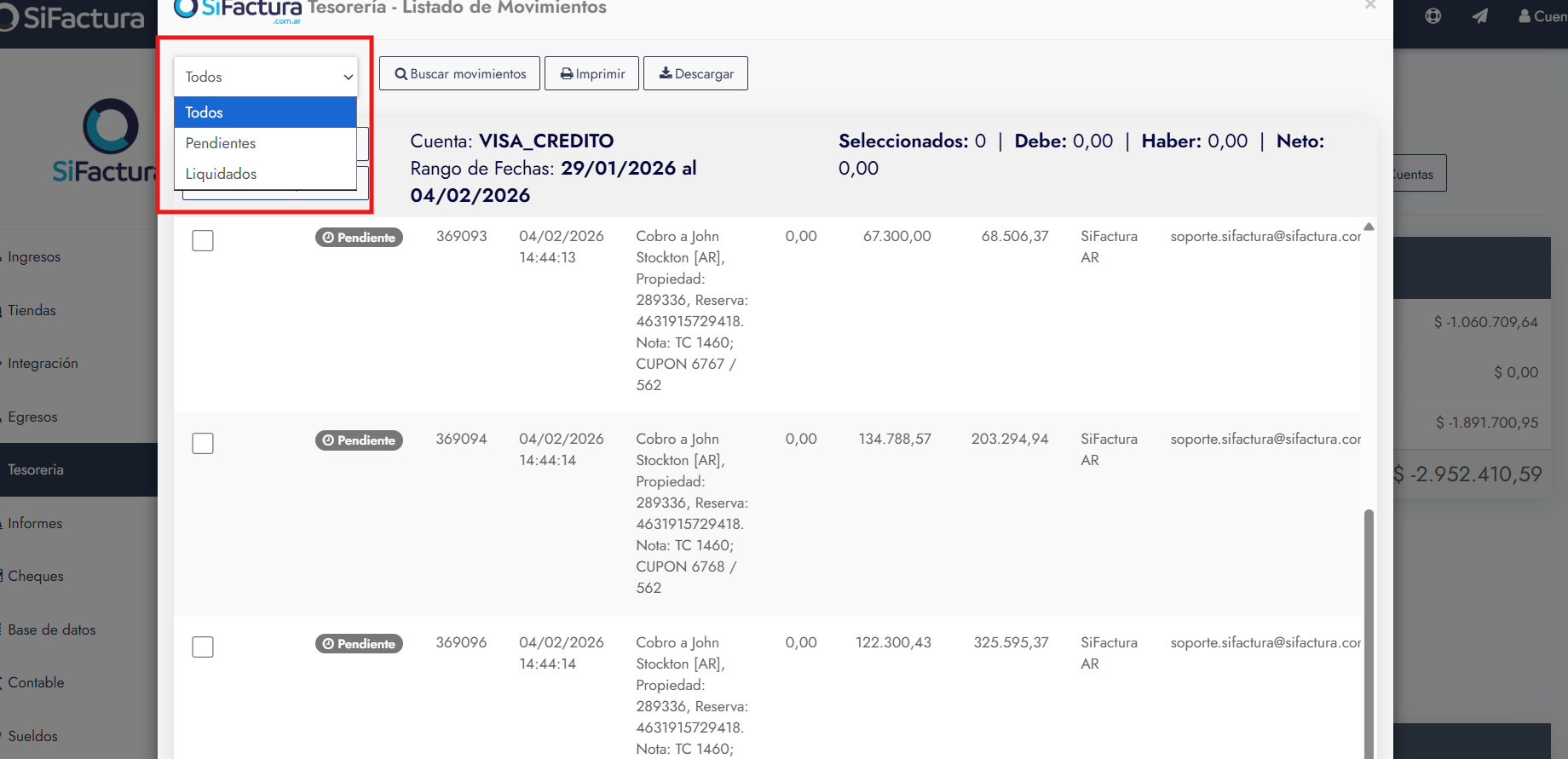 La clasificación Tarjeta es la que habilita el control por estado (Pendiente / Liquidado) y las acciones de liquidación desde el listado de movimientos.
