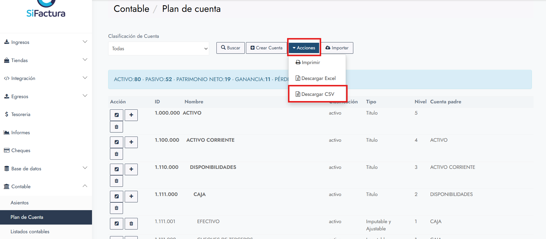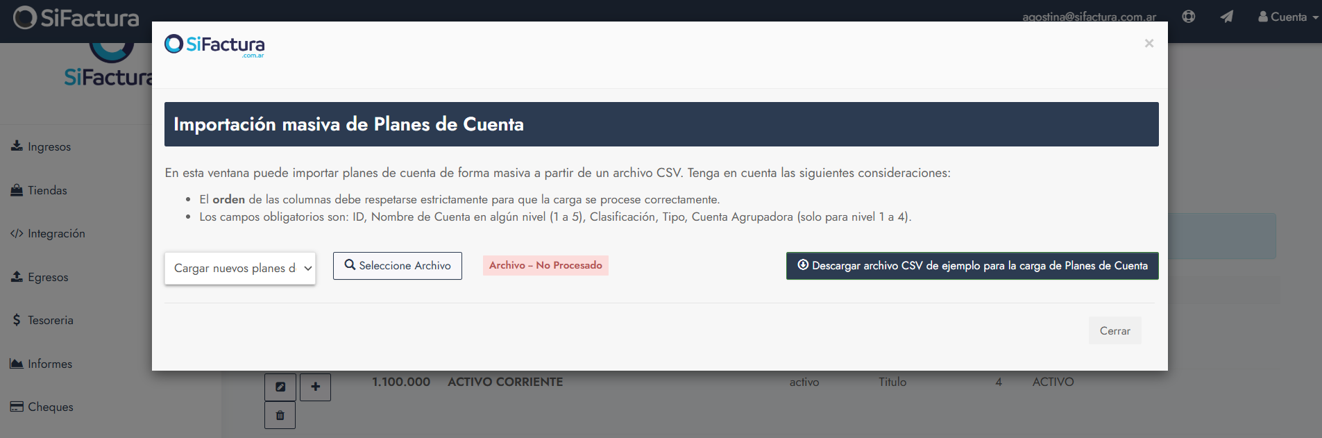 Este artículo explica cómo descargar y preparar correctamente el archivo de importación del Plan de Cuentas en SiFactura, partiendo del archivo CSV obtenido desde el sistema y trabajándolo en Excel antes de completarlo e importarlo.