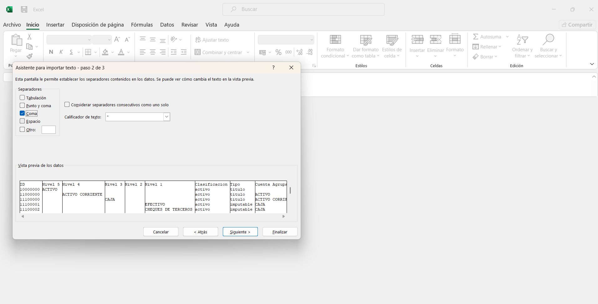 Si ves los datos separados por ; > marca Punto y coma