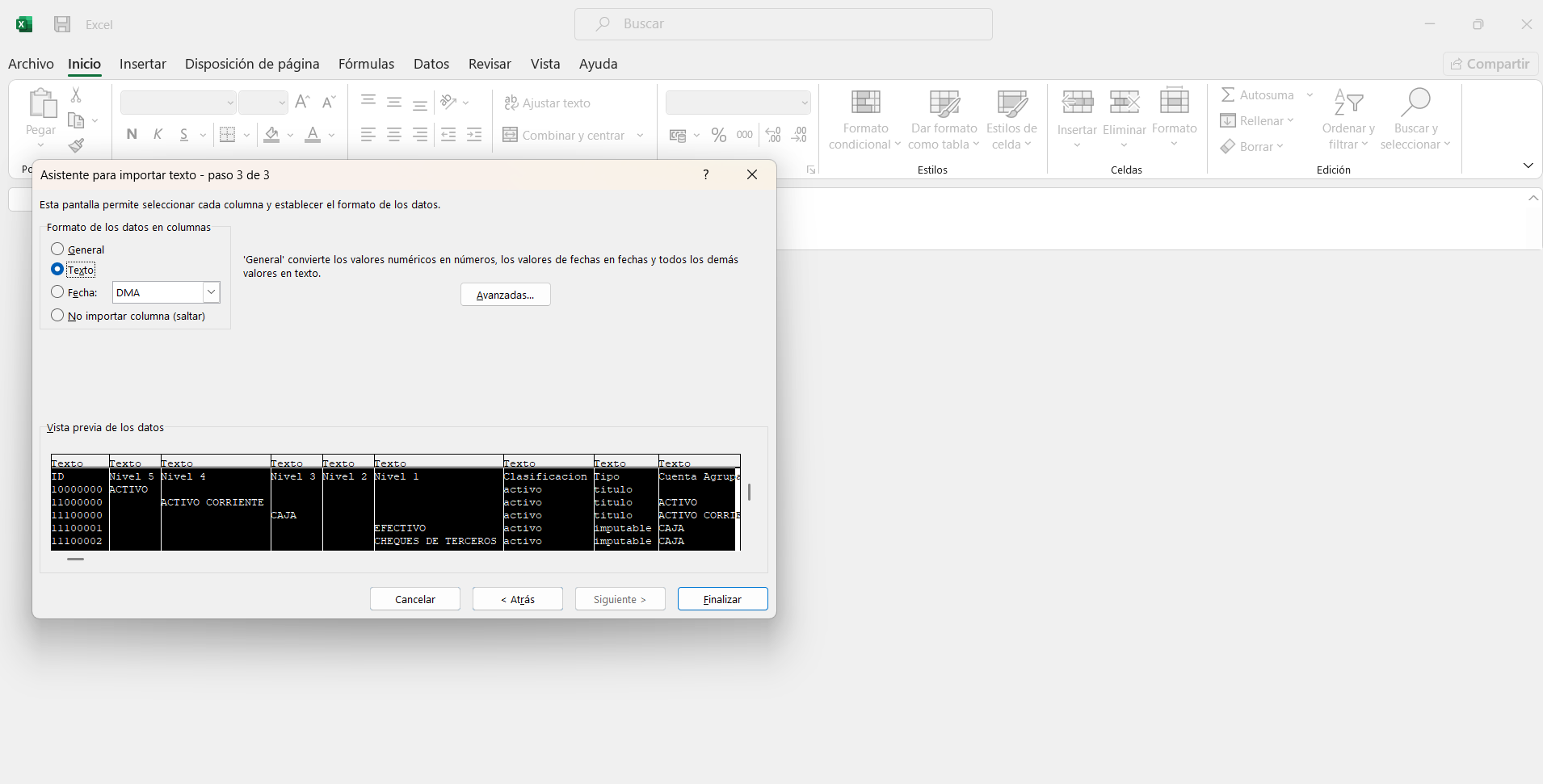 Con todas las columnas seleccionadas, elige el formato Texto.