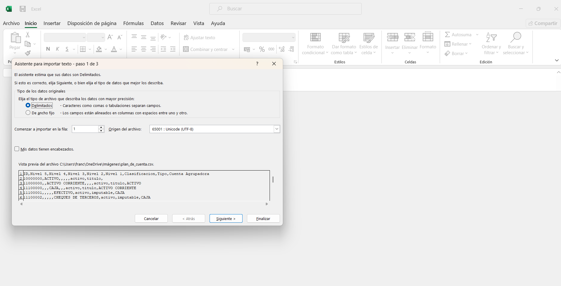 Verifica que el Origen del archivo sea Unicode (UTF-8).