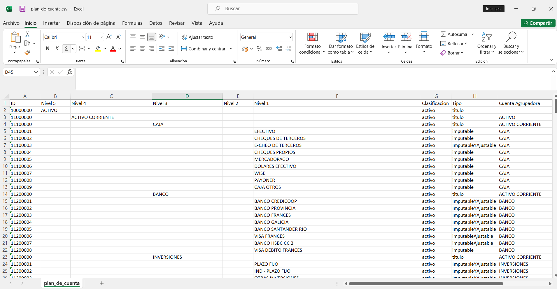 Este archivo contiene todas las cuentas actuales, con su estructura real y jerarquía.